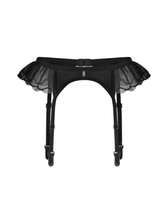 Tiulowa falbanka dodaje lekkości, a głęboka czerń podkreśla wyrafinowany charakter bielizny. Regulowane paski umożliwiają idealne dopasowanie pończoch, zapewniając wygodę i stabilność. Z tyłu znajduje się kilkustopniowe zapięcie, które pozwala na precyzyjne dopasowanie do sylwetki.